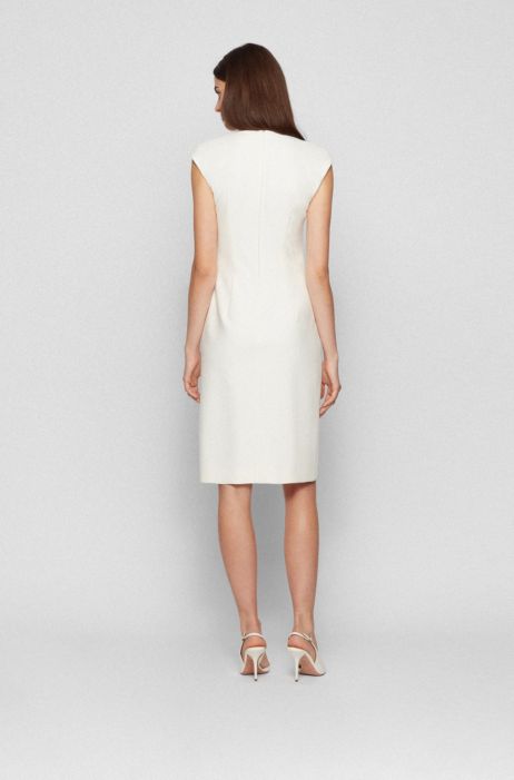 Cute overlapping detail on the front. 17 Underarm to end of sleeve. Designers took a classic long-sleeve shift dress to the next level with unexpected details like an overlapping panel in the front and a shiny exposed zipper in the back.